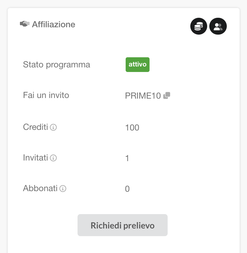 Una volta confermato al nostro team di voler prendere parte al programma di affiliazione, sul tuo account, comparirà una nuova card nella dashboard.